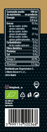Etiqueta Limpia: No contiene azúcar, sal, OGM (organismos genéticamente modificados), y es vegano y ecológico.