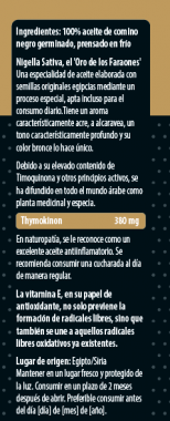 Timquinona: Contiene Timoquinona (380 mg/100 ml). Es un compuesto conocido desde la antigüedad y que se ha difundido en todo el mundo árabe como planta medicinal y especia.
