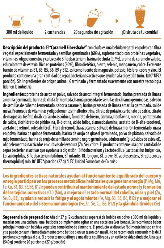 Es un batido de fibra, 100% VEGANO, que puedes tomar todos los días por tu salud y para mimarte. Lo que lo hace especial es que las semillas que contiene conservan su máximo valor nutritivo original y su contenido natural en vitaminas, ya que, como resultado de nuestras investigaciones, son cuidadosamente germinadas, fermentadas y secadas mediante un proceso único. ACTIVE BALANCE SALTY CARAMEL FIBERSHAKE es un alimento complejo completo, o SUPERALIMENTO.