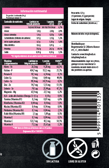 Ingredientes Clave: Mezcla de proteínas vegetales (arroz, cáñamo, guisante y lino) , fresa en polvo, frambuesa en polvo, zumo de acerola en polvo, ácido hialurónico.